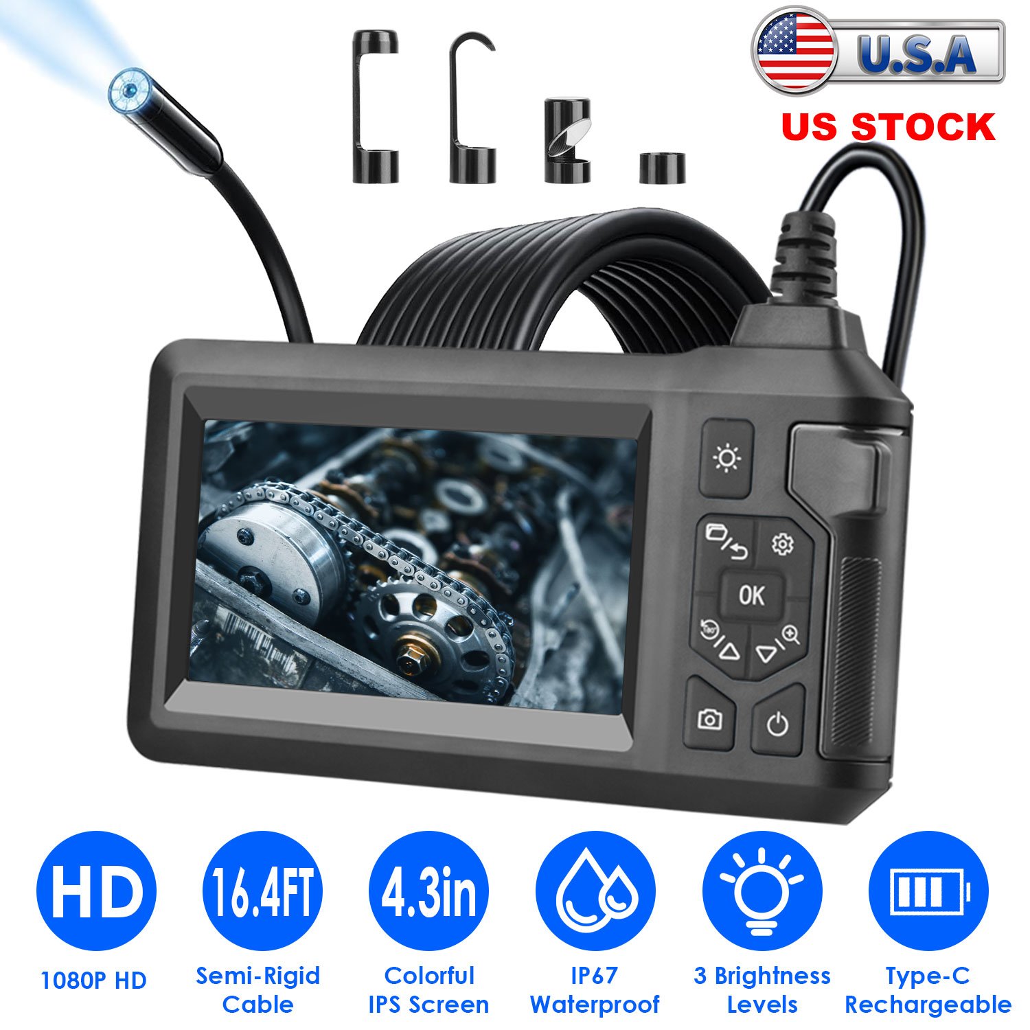 1080P Endoscope Camera with 8 LED Light 8mm Borescope Inspection Camera 4.3” Colorful Screen IP67 Waterproof 16.4FT Semi-Rigid Cord Handheld Snake Cam